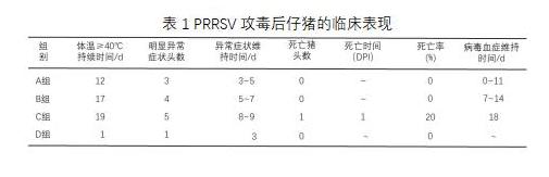PRRSV攻毒對仔豬臨床表現(xiàn)的影響情況見表1。